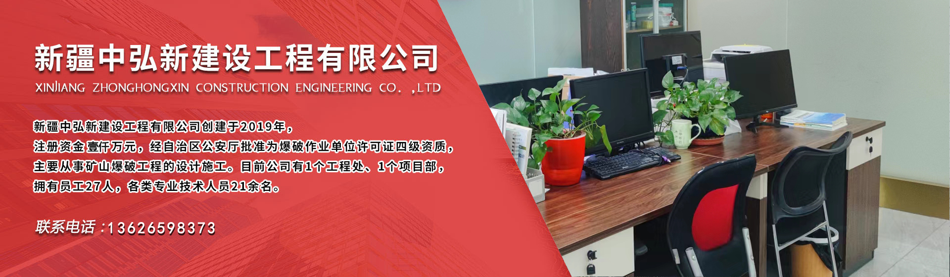 ZHONGHONGXIN CONSTRUCTION ENGINEERING   公 司 簡(jiǎn) 介新疆中弘新建設(shè)工程有限公司創(chuàng)建于2019年,注冊(cè)資金壹仟萬元,經(jīng)自治區(qū)公安廳批準(zhǔn)為爆破作業(yè)單位許可證四級(jí)資質(zhì),主要從事礦山爆破工程的設(shè)計(jì)施工、礦上采掘施工業(yè)務(wù)。目前公司有1個(gè)工程處、2個(gè)項(xiàng)目部,分...